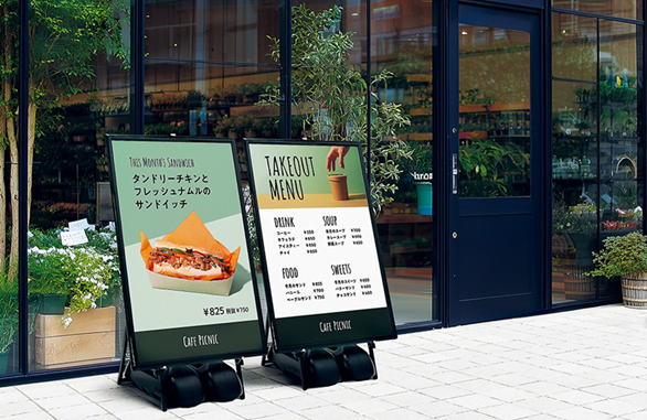 飲食店や商業施設の入り口に設置するメニューやキャンペーン告知など、移動の多いポスター掲示に最適です。