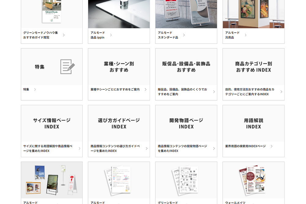アルモードブランドの製品群は、ポスター用パネル、掲示板、スタンド看板、パーテーション、バナースタンドなどディスプレイ/サイン領域の広範をカバーしています。商品情報コンテンツではそのすべてをカテゴリごとに分けて、かつ各カテゴリごとに「選び方」「機能・特徴」「おすすめ」「サイズ・色」などを設けていることから、利用者が「自分の目的(例えば屋外用ポスターフレーム/飛沫防止パーテーション/屋外スタンド看板)なのか」を明確にしながら探せる構造になっています。