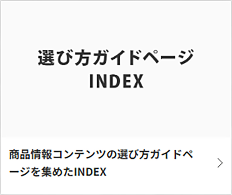 各商品カテゴリーごとの「選び方ガイド」コンテンツページを集めたINDEXです。商品選び、用途選びの際の参考に、また各商品をまたいでご使用の場合の参考にご覧ください。