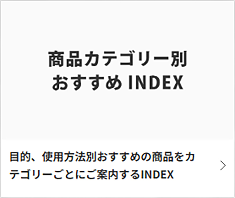 各商品カテゴリーごとの「おすすめ」コンテンツページを集めたINDEXです。商品選び、用途選びの際の参考に、また各商品をまたいでご使用の場合の参考にご覧ください。