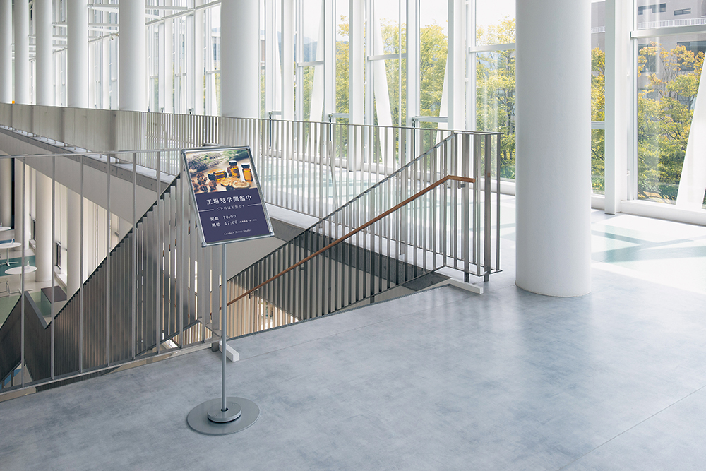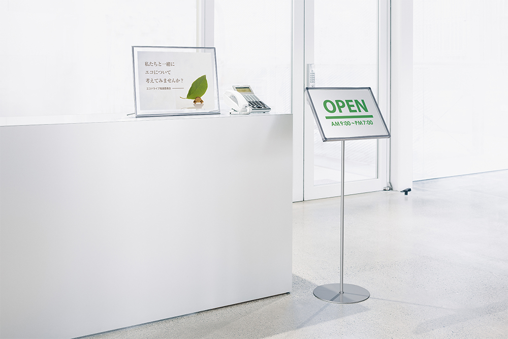 駅、空港、サービスエリア、道の駅、ターミナルなどには様々な情報掲示が必要です。多くの人が行き交うため、2835などのしっかりしたフレーム付きの案内も検討してください。広い通路や空間では遠くからキャッチしてもらう必要があるため、ポスタースタンドなどの大型のスタンドが有効です。土産物店や各テナント、インショップなどの店頭入口にはフロアスタンドは適しています。