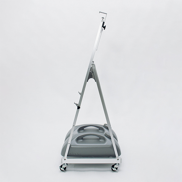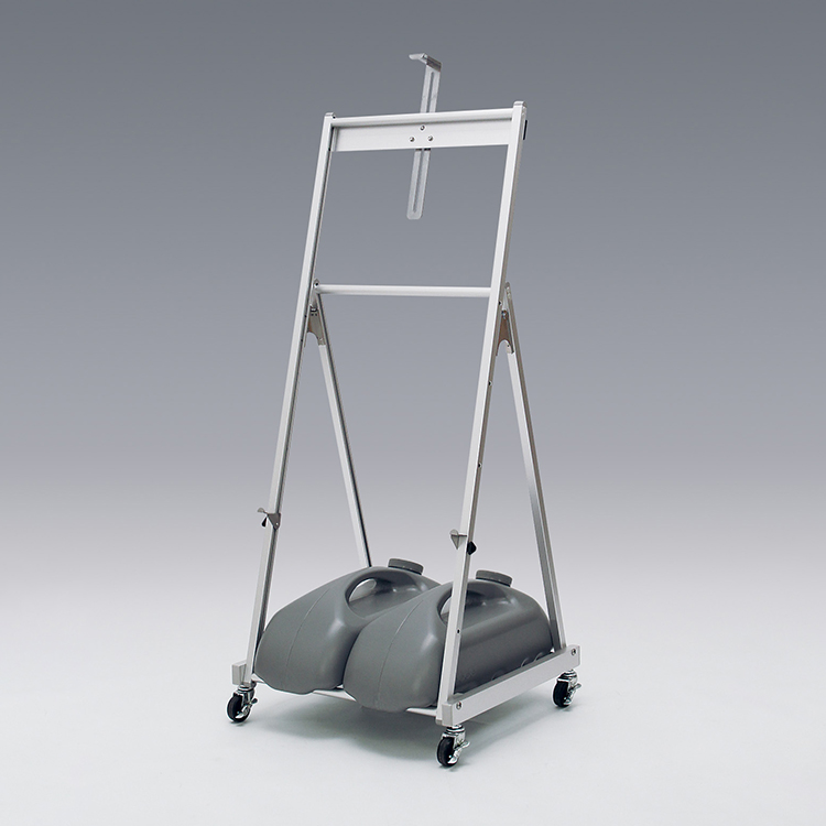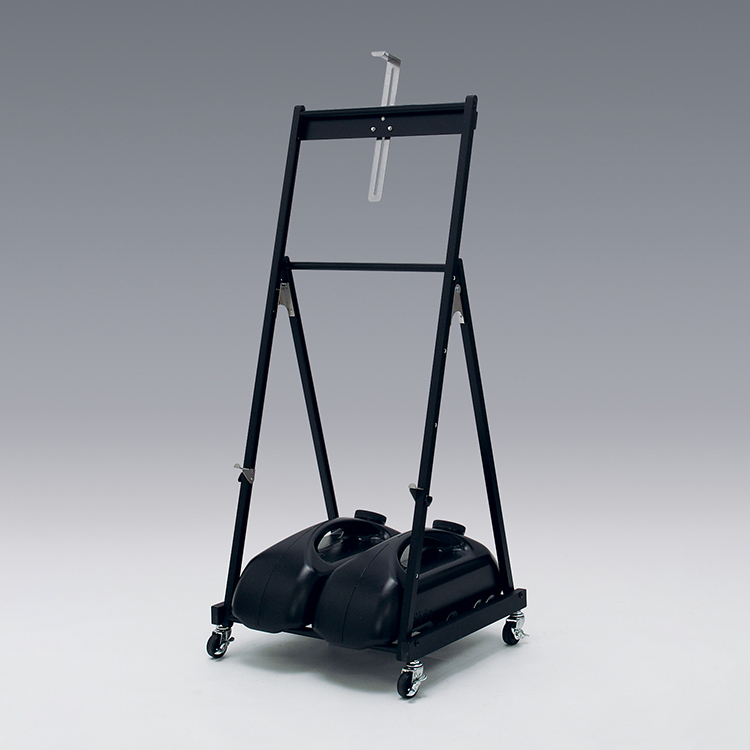 今回は基本スタイルとは異なる、全く新しい形の屋外用キャスター付きパネルスタンドを開発しました。構造上の強度、便利な機能性、見た目のシンプルさ、現場での使いやすさを追求したものです。組み立て式にして強度を持たせ、キャスター付きで下部に負荷がかかる構造でも工学的に強度を確保しました。見た目はしなやかでシンプルに仕上げ、使いやすく、重りやウエイトを載せて安定設置できます。パネル受けもズレ落ちないようネジ固定で安定させています。