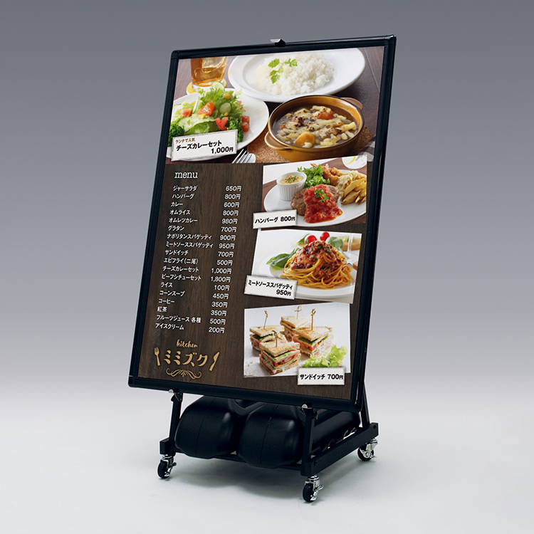 キャスター付きなので移動がラクラクです。毎日出し入れするメニューや入店促進用スタンドにおすすめです。屋内ではポリウエイトなしでも使用できます。細身でシンプルな形状のため、どんなシーンにもマッチします。