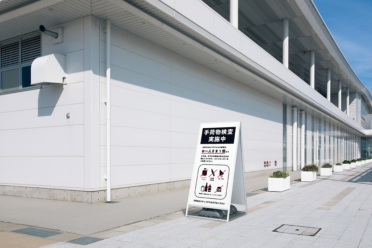 球技場、競技場、競馬場、競艇場、競輪場、オートレース場などの大型施設の屋内部分には、置く場所を注意して通行の妨げにならないようにしてください。壁自体が限られるので、入場するお客様向けにはスタンドの案内は有効です。一度に多くの人が集まるため、的確に早く誘導しなければならず、人による案内では手に負えません。適所にスタンド看板を設置して案内を行ってください。