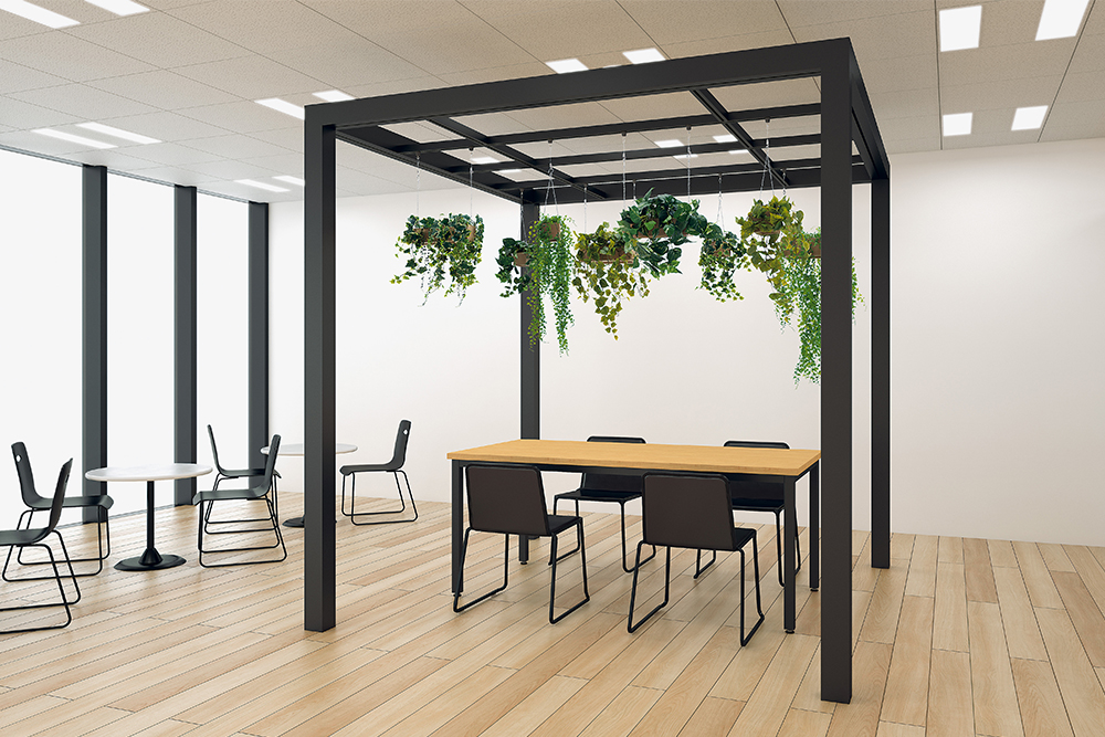 打ち合わせテーブル、休憩テーブル、食堂、食事、休憩スペースと通路を仕切る、装飾する場合、仕切りすぎない高さが低いボックス形状で、グリーン装飾のボリュームがあるボックスプランターや、デザインパーテーションが使いやすいアイテムです。