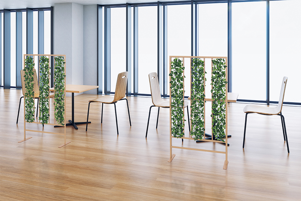 ワークスペースの机やフリースペースの大きなテーブル、食堂の長テーブルなど完全に遮断まではいかなくても、ちょっとした仕切りが欲しいと感じる場所があります。そんなテーブルに、高さの低いロータイプの間仕切りポットが役立ちます。薄型なのでテーブルの面積を確保できます。程よい高さと上部のグリーンで、仕切りの機能と装飾を兼ねた演出が可能です。