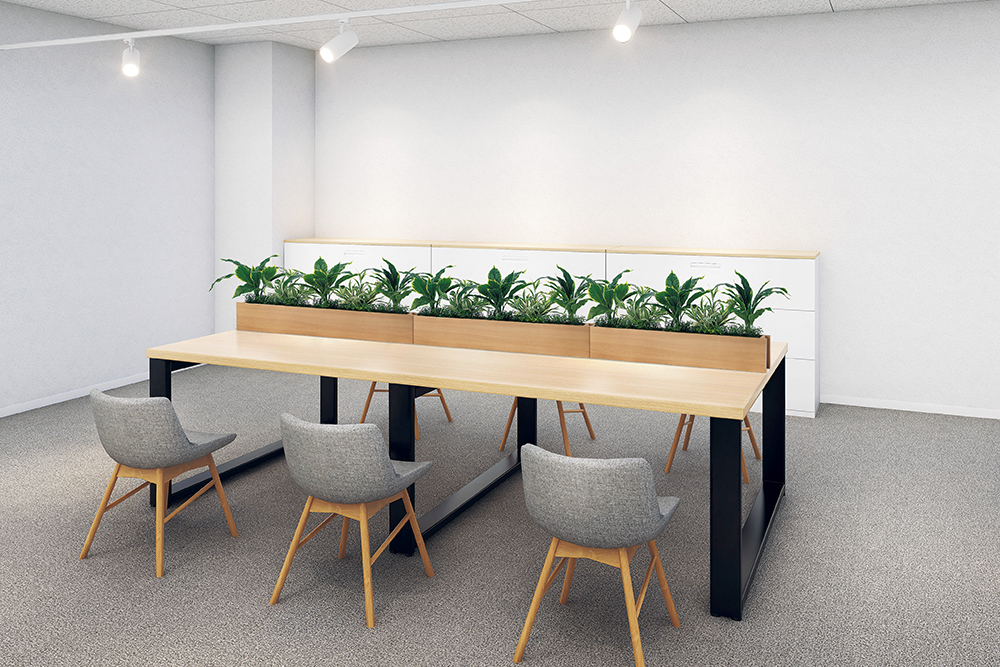 共有スペースでは、人の動線を分けるためのグリーンパーテーションとしてスタンド型を配置。会議エリアには、集中とリラックスを両立させる緑視効果が期待されます。