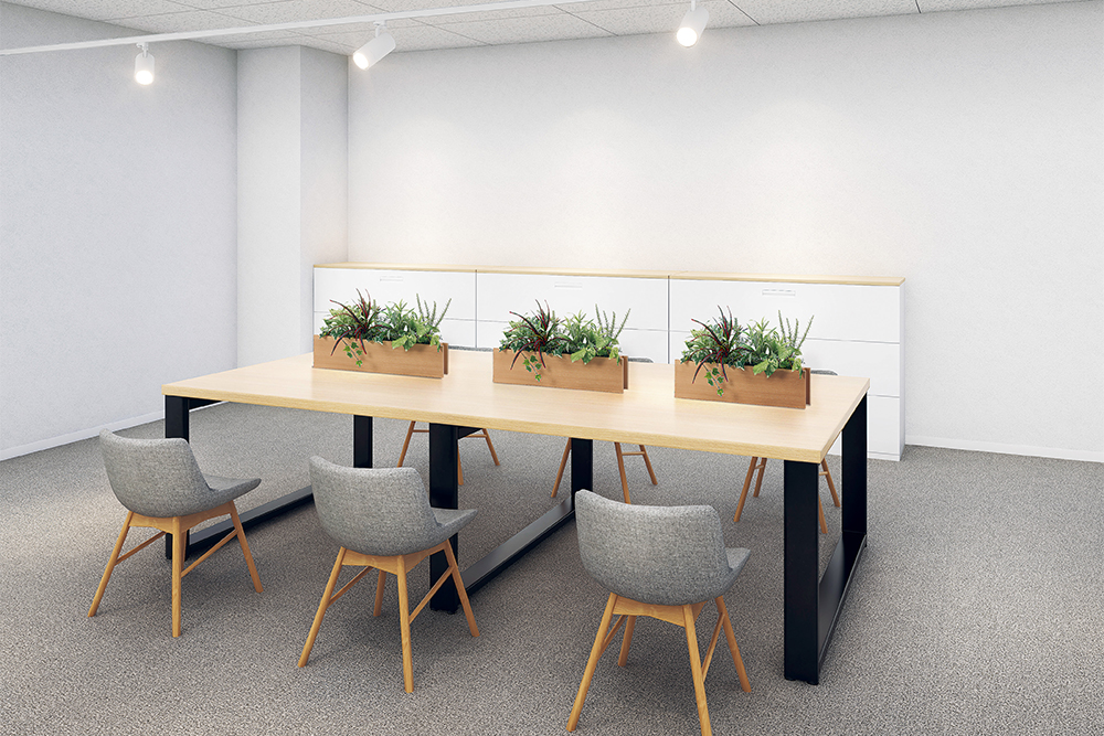 打ち合わせスペースやフリーデスクゾーンなど、社員が自由に集う共有空間では、「可動性」と「ゾーニング効果」を意識した汎用グリーンの活用が効果的です。