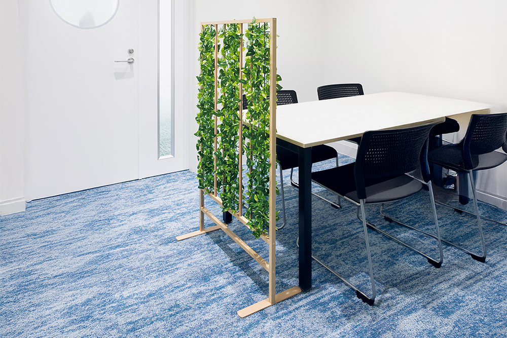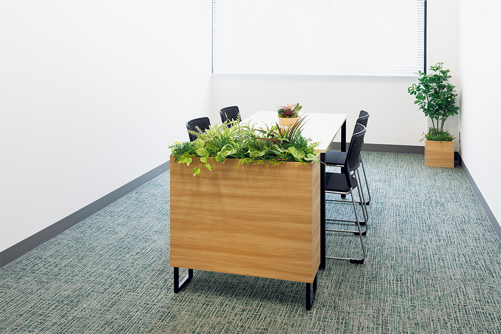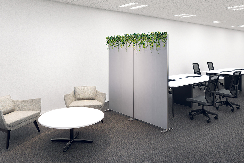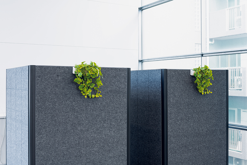キャスター付きのパーテーショングリーンを配置することで、視線を程よく遮りながら、開放的で落ち着いたミーティング環境を作ることができます。