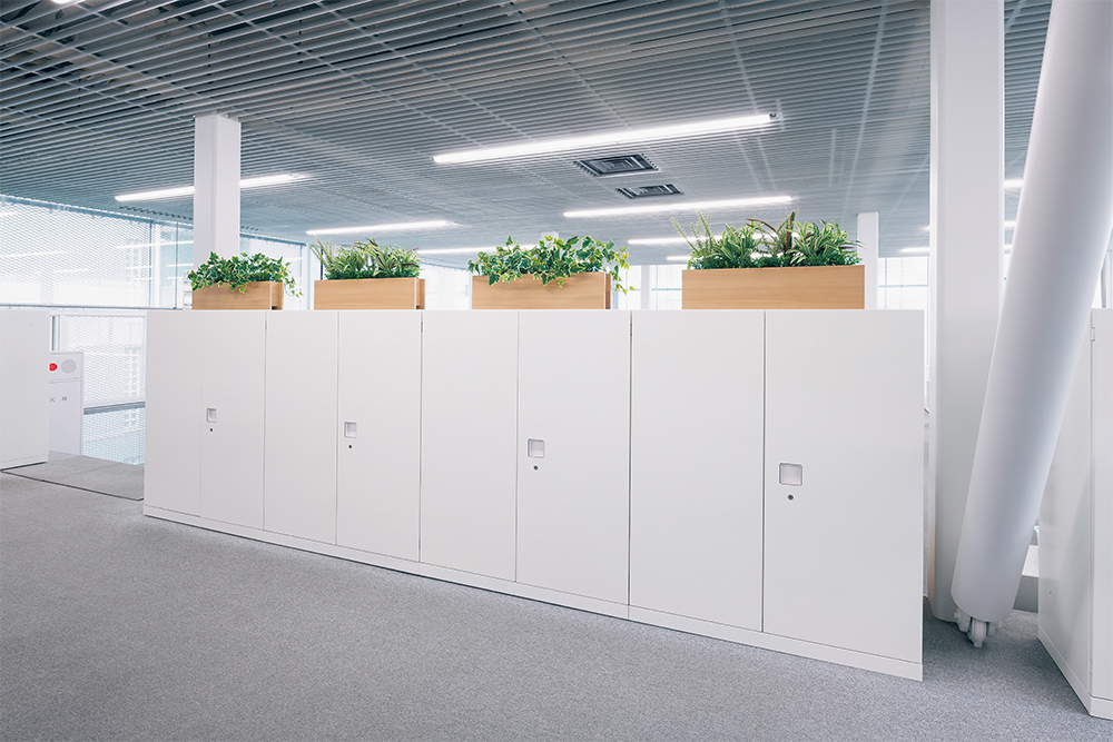 また、通路やコピー機まわりなど共用エリアにスリムタイプのフロアスタンドグリーンを配置することで、視覚的な区切りと空間デザインの統一感が得られます。