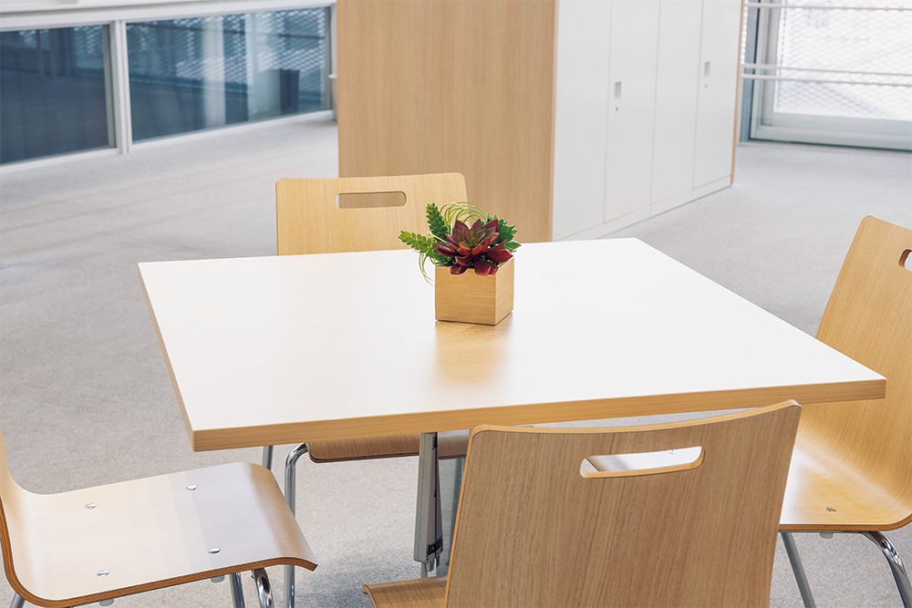 また、テーブル上に小型の卓上グリーンスタンドやフェイクプランツのアレンジメントを置くことで、コミュニケーションを促し、和やかな雰囲気をつくります。