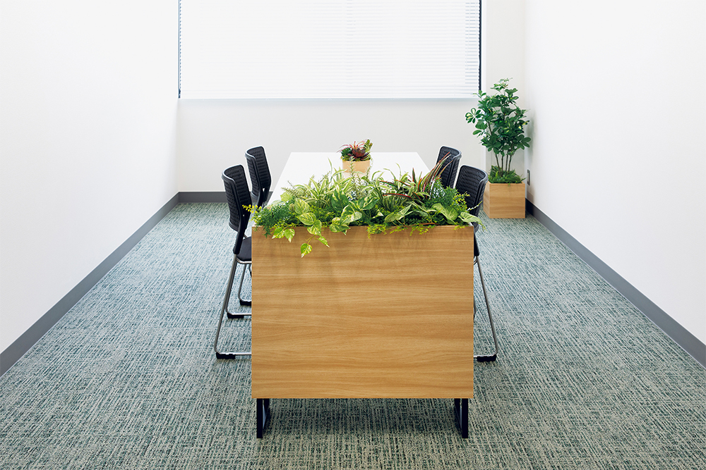 オフィスのワークスペースでは、集中力と快適性を両立するグリーン演出が求められます。