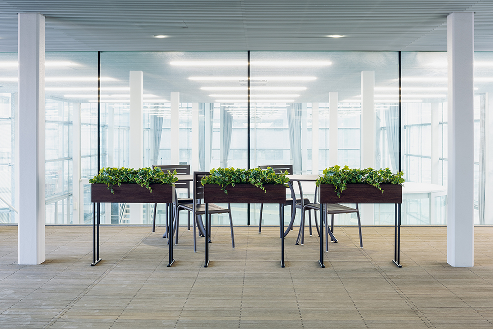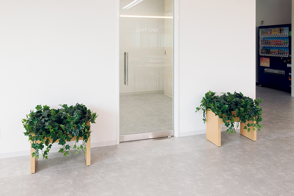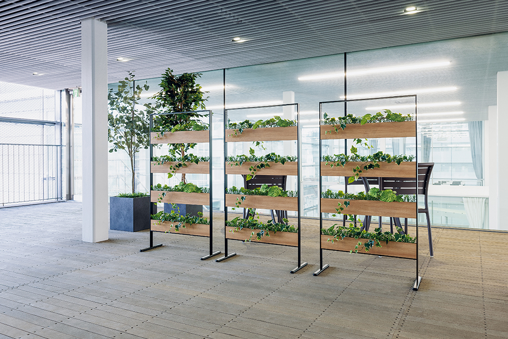 休憩スペースは心の切り替えを促す場所。ボックスタイプのグリーンスタンドを置くと、自然な緑の壁のように空間を包み込み、社員のリラックス効果を高めます。人工観葉植物を使うため日当たりを気にせず設置でき、メンテナンスも簡単。