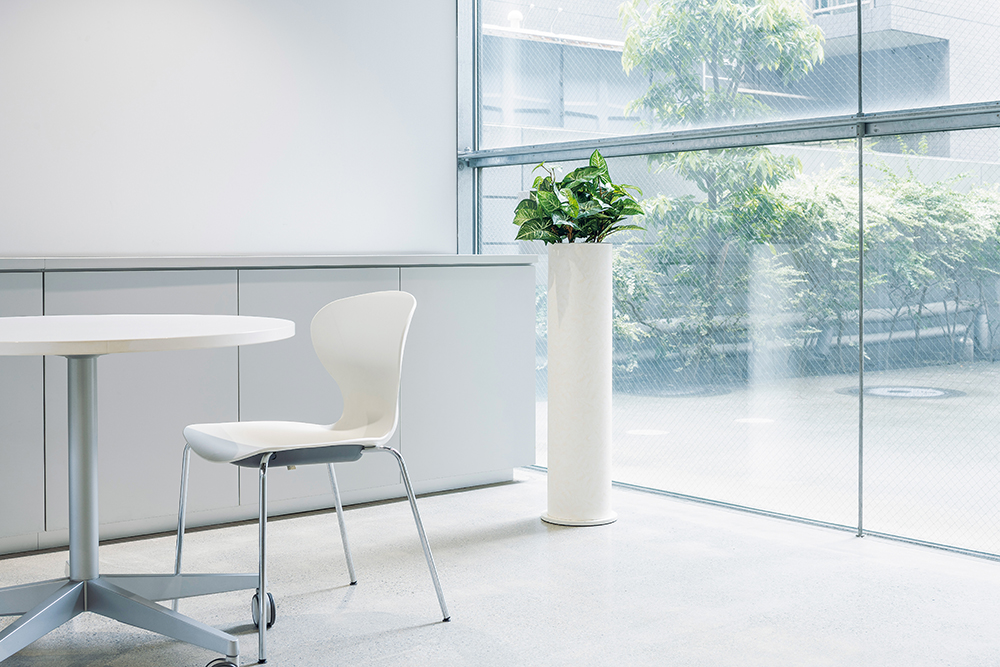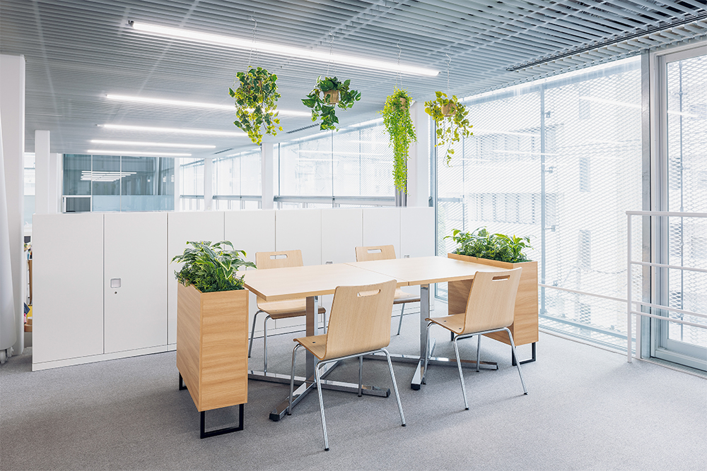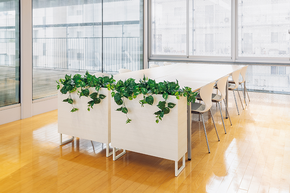 共有スペースでは、自由に動かせる軽量タイプやキャスター付きのグリーンスタンドが便利です。打ち合わせエリアと動線をゆるやかに仕切りながら、緑で柔らかい印象をプラスします。