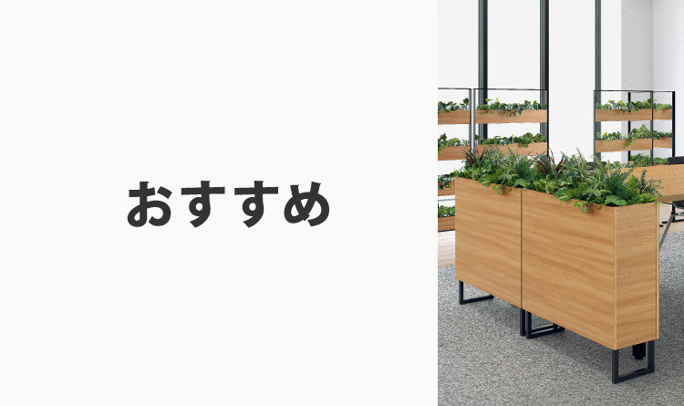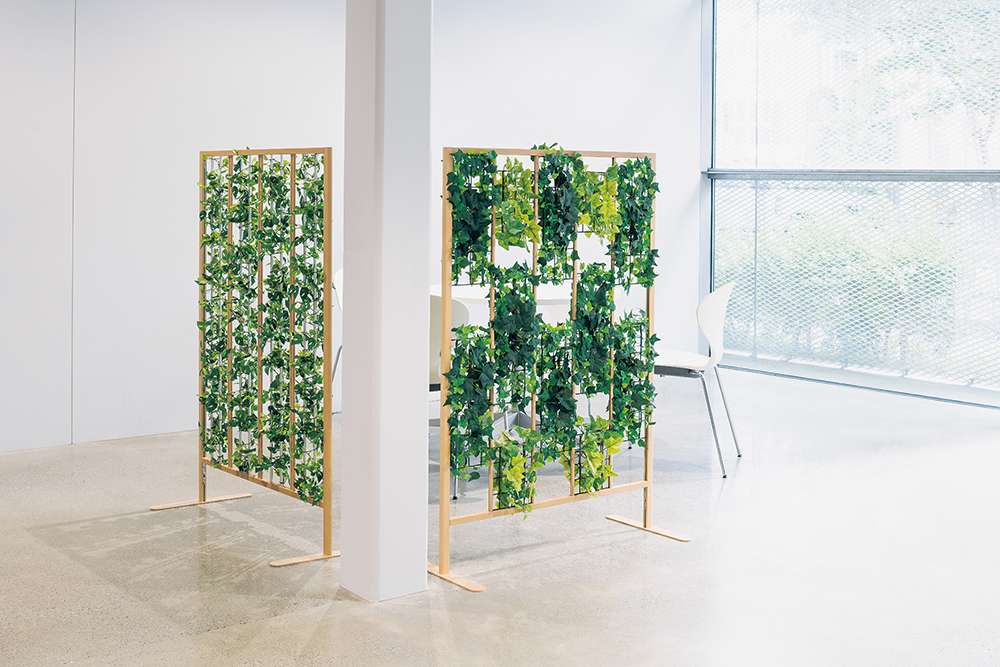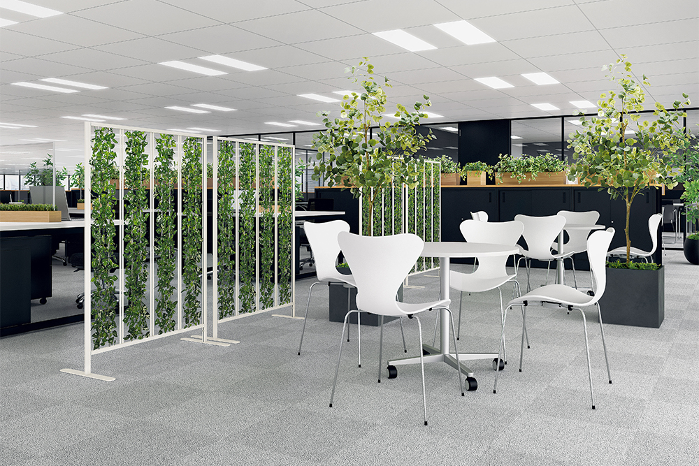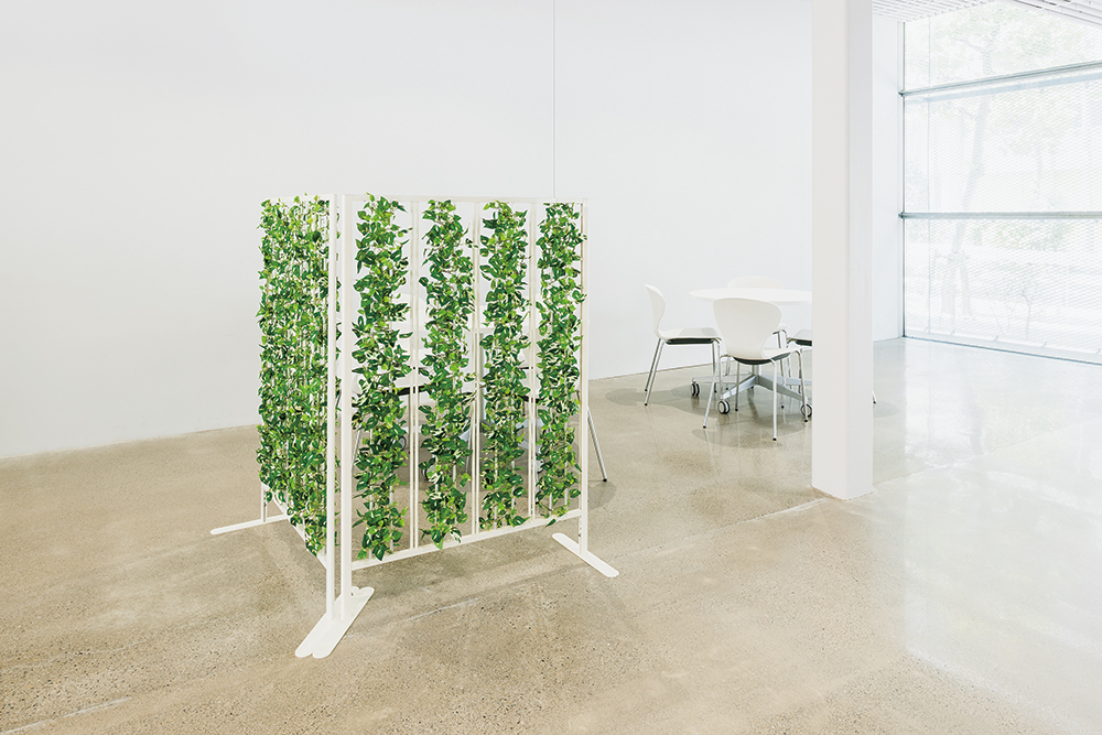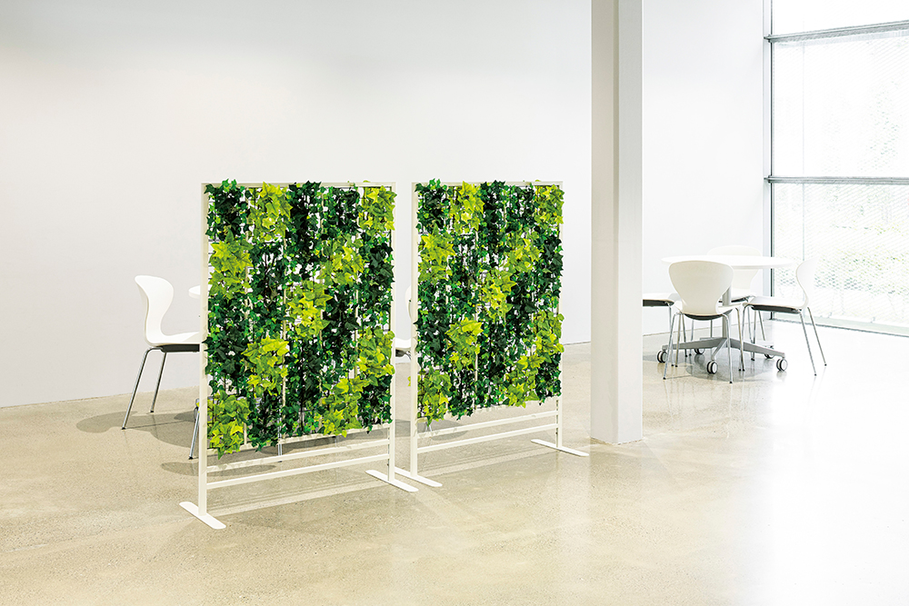空間をインテリア感覚で、手軽におしゃれに間仕切りできるカジュアルなパーテーション。グリーンアレンジやシルエットがスタイリッシュで、いろいろなシーンで使いやすいです。