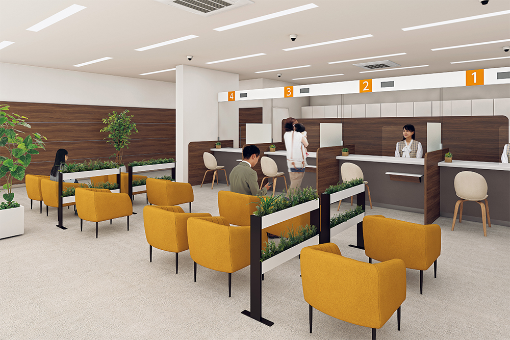 役所・庁舎の待合エリアや窓口スペースでは、利用者が安心して過ごせる空間づくりが求められます。グリーンスタンドを導入することで、視覚的なリラックス効果と清潔感を付加できます。
