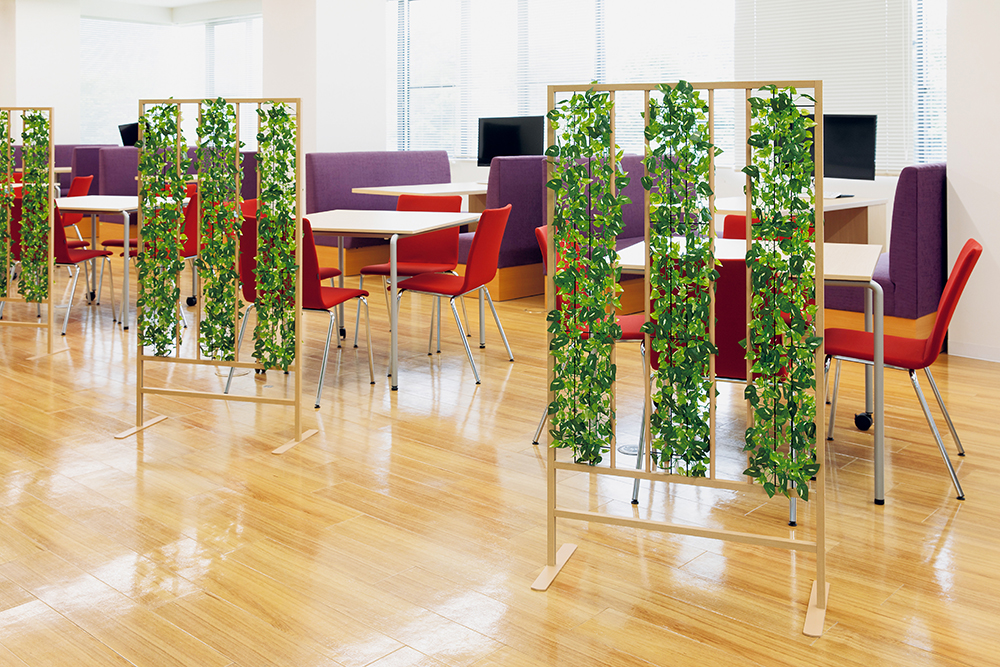 グリーンスタンドを設置して囲って空間を作る、囲ってスペースをつくることが可能です。直角にする角の部分がポイントで、1枚のパーテーションや1台のスタンドで囲える商品があります。