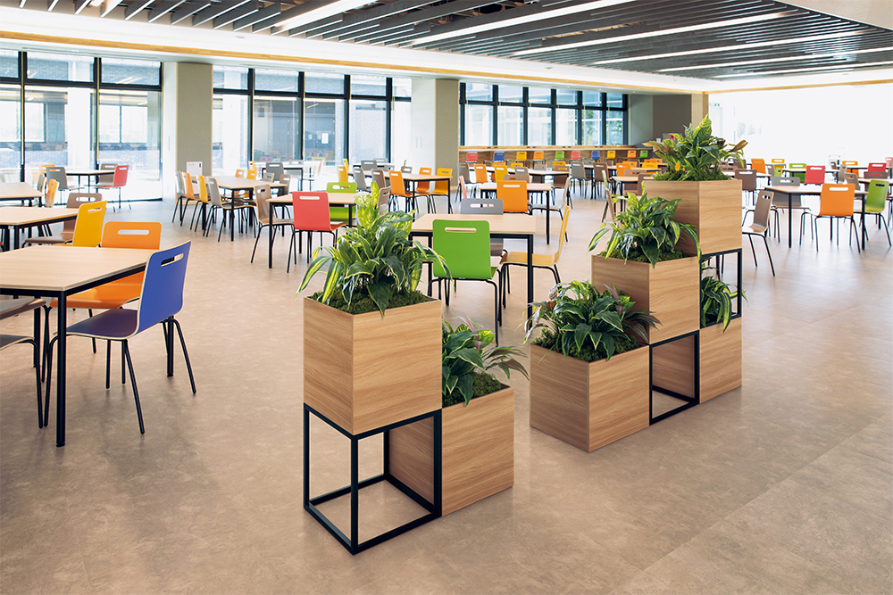 広い商業空間では、ゾーニングを明確にするための仕切りとしてグリーンスタンドが効果的。大型のプランタータイプでエリアを分けつつ、通行者に安心感と視覚的リフレッシュを与えます。