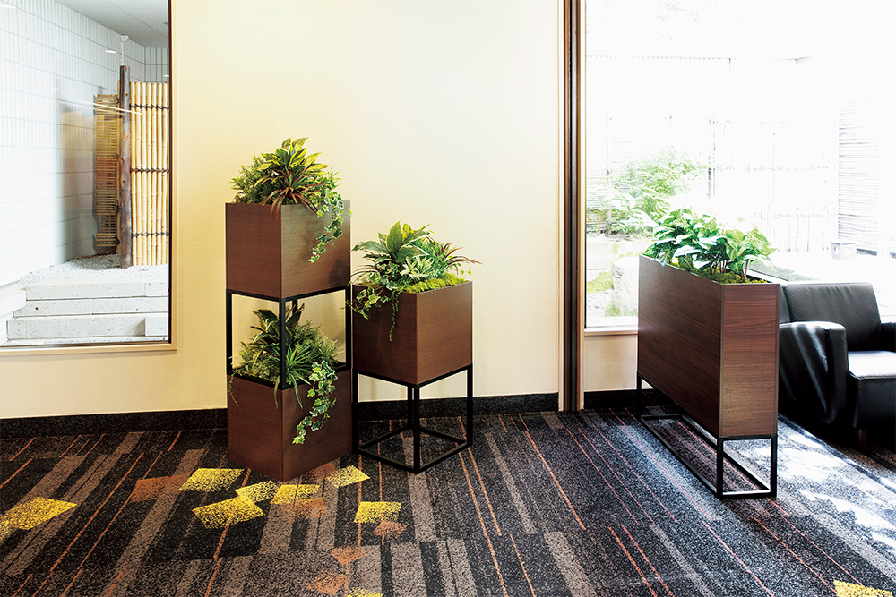 ロビーや受付は企業の「顔」。高級感のあるグリーンスタンドを配置すれば、来客に清潔で上質な印象を与えます。