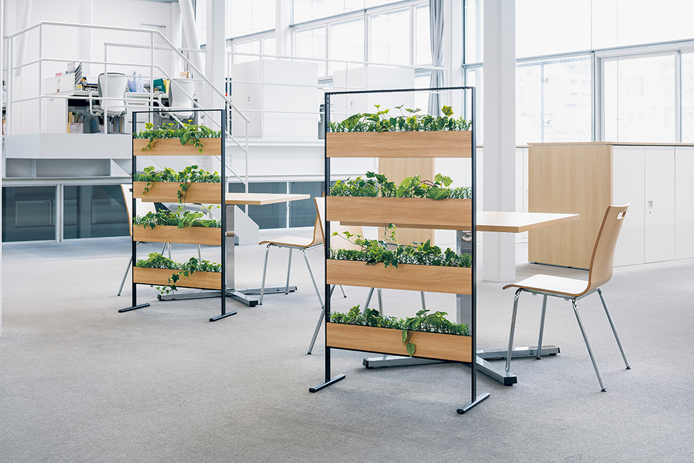 間仕切りタイプのパネルパーテーション。グリーンの持つ癒しと発想を生む効果に仕切り用途を組み合わせた新スタイルのグリーンパーテーションです。