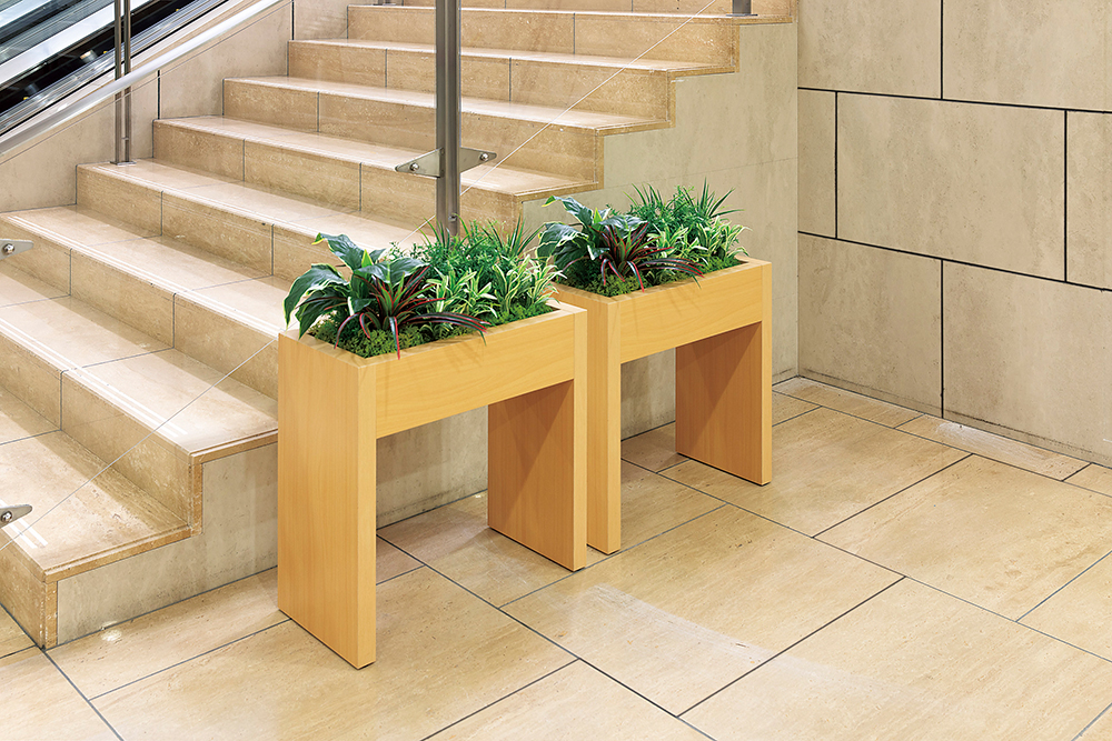 自由な展開が可能で、メンテナンスがしやすいことも重要です。業者がメンテナンスで頻繁に出入りするのは、安全面も含めて好ましくないと考えられるため、フェイクグリーン、人工樹木での装飾をおすすめします。