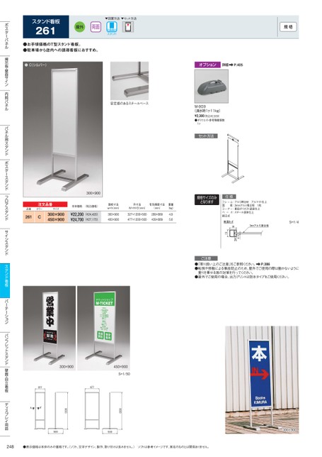 ●「取り扱い上のご注意」をご参照ください。●転倒や移動による事故防止のため、屋外でご使用の際は動かないようにP.386重りを乗せる等の対策を行ってください。●屋外でご使用の場合、出力プリントは防水タイプをご使用ください。スタンド看板261▼設置方法▼セット方法屋外両面スタンド●お手頃価格のT型スタンド看板。●駐車場から店内への誘導看板におすすめ。規格C(シルバー)オプション詳細P.405安定感のあるスチールベースM-909(満水時1ヶ11kg)¥2,300(税込¥2,530)●ポリウエイト参考積載個数1ヶセット方法S=1/4規格サイズのみとなります仕様フレーム:アルミ押出材アルマイト仕上面板:3mmアルミ複合板1枚コーナー:亜鉛ダイカスト塗装仕上ベー組立式ス:スチール塗装仕上ご注意300×900注文品番品番カラーサイズ本体価格(税込価格)261C300×900450×900¥22,200(¥24,420)¥24,700(¥27,170)面板寸法w×hmm)300×900450×900外寸法W×H×D(mm)有効画面寸法(mm)重量(kg)327×1200×500477×1200×500289×889439×8894.95.6300×900300×900450×900S=1/50ポスターパネル掲示板・壁面サイン内照パネルパネル用スタンドポスタースタンドフロアスタンドサインスタンドスタンド看板パーテーションパンフレットスタンド壁面・自立看板ディスプレイ用品248●表示価格は本体のみの価格です。ソフト、文字デザイン、製作、取り付けは含みません。)ソフトは参考イメージです、実在のものとは関係ありません。