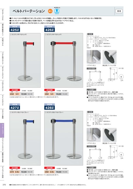 ベルトパーテーション屋内▼設置方法スタンド規格●ポールにベルトが内蔵されており、引っぱるとベルトが伸縮し、キャッチ部分に引掛けて接続します。ベルトがはずれないロック機能付き。●スタッキングベースで積み重ねて収納できます。ベース表面は写り込みのないヘアライン仕上。●ベルトカラーは2色から、それぞれ1台セット、2台セットからお選びいただけます。NEW425NEW426S(ステン)R(ベルトレッド)S(ステン)R(ベルトレッド)仕様ト:強化ポリエステルR(レッド)L1700×巾48mmルポール・ヘッド:ステンレスベベースカバー:ステンレスヘアライン仕上ベサ重入数:(425Z)1台セット/(426Z)2台セット組立式ス:セメント床当たりクッション付きズ:(ベース)φ350mm(ポール)φ50mm総高さ890mm量:7.8kg1台)ーイヘアライン仕上裏全面にクッション付きセット方法S=1/50ベルトパーテーションを間隔をあけて並べて、一方のパーテーションからベルトを引き出し、もう一方にベルトを掛けます。ご注意●「取り扱い上のご注意」をご参照ください。●スタッキングベースのくぼみ部分に焼け色や養生シートが少しP.386残る場合があります。●ステンレスはさびにくい素材ですが、手の油、ほこりなどの付着したよごれからもらいさびを起こすことがあります。状況により短期間でもさびや変色する場合があります。注文品番品番425ZカラーS-R本体価格(税込価格)¥22,900(¥25,190)注文品番品番426ZカラーS-R本体価格(税込価格)¥36,800(¥40,480)※425Zと426Zのちがいは、1台セット1梱か2台セット1梱のちがいです。商品本体は同じ物です。ト:強化ポリエステルBU(ブルー)L1700×巾48mmルポール・ヘッド:ステンレスベベースカバー:ステンレスヘアライン仕上ベサ重入数:(427Z)1台セット/(428Z)2台セット組立式ス:セメント床当たりクッション付きズ:(ベース)φ350mm(ポール)φ50mm総高さ890mm量:7.8kg1台)ーイヘアライン仕上裏全面にクッション付きセット方法S=1/50ベルトパーテーションを間隔をあけて並べて、一方のパーテーションからベルトを引き出し、もう一方にベルトを掛けます。ご注意●「取り扱い上のご注意」をご参照ください。●スタッキングベースのくぼみ部分に焼け色や養生シートが少しP.386残る場合があります。●ステンレスはさびにくい素材ですが、手の油、ほこりなどの付着したよごれからもらいさびを起こすことがあります。状況により短期間でもさびや変色する場合があります。注文品番品番カラー本体価格(税込価格)注文品番品番カラー本体価格(税込価格)427ZS-BU¥22,900(¥25,190)428ZS-BU¥36,800(¥40,480)※427Zと428Zのちがいは、1台セット1梱か2台セット1梱のちがいです。商品本体は同じ物です。NEW427NEW428S(ステン)BU(ベルトブルー)S(ステン)BU(ベルトブルー)仕様ポスターパネル掲示板・壁面サイン内照パネルパネル用スタンドポスタースタンドフロアスタンドサインスタンドスタンド看板パーテーションパンフレットスタンド壁面・自立看板ディスプレイ用品270●表示価格は本体のみの価格です。ソフト、文字デザイン、製作、取り付けは含みません。)ソフトは参考イメージです、実在のものとは関係ありません。