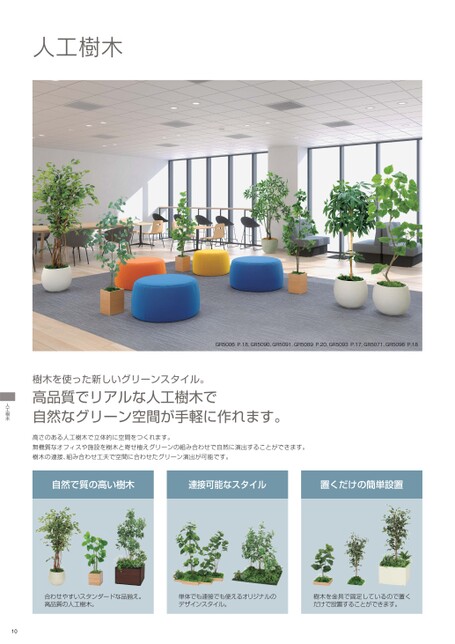 GR5006P.18、GR5090、GR5091、GR5089P.20、GR5093P.17、GR5071、GR5096P.18自然で質の高い樹木連接可能なスタイル置くだけの簡単設置高さのある人工樹木で立体的に空間をつくれます。無機質なオフィスや施設を樹木と寄せ植えグリーンの組み合わせで自然に演出することができます。樹木の連接、組み合わせ工夫で空間に合わせたグリーン演出が可能です。高品質でリアルな人工樹木で自然なグリーン空間が手軽に作れます。人工樹木樹木を使った新しいグリーンスタイル。合わせやすいスタンダードな品揃え。高品質の人工樹木。単体でも連接でも使えるオリジナルのデザインスタイル。樹木を金具で固定しているので置くだけで設置することができます。10人工樹木