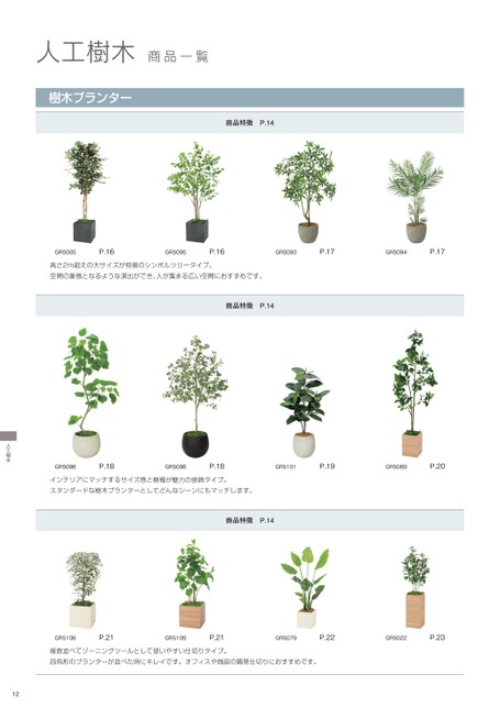 GR5005P.16GR5095P.16GR5093P.17GR5094P.17高さ2m超えの大サイズが特徴のシンボルツリータイプ。空間の象徴となるような演出ができ、人が集まる広い空間におすすめです。商品特徴P.14GR5096P.18GR5098P.18GR5101P.19GR5089P.20インテリアにマッチするサイズ感と樹種が魅力の装飾タイプ。スタンダードな樹木プランターとしてどんなシーンにもマッチします。商品特徴P.14GR5106P.21GR5109P.21GR5079P.22GR5022P.23複数並べてゾーニングツールとして使いやすい仕切りタイプ。四角形のプランターが並べた時にキレイです。オフィスや施設の簡易仕切りにおすすめです。人工樹木12人工樹木商品一覧樹木プランター商品特徴P.14