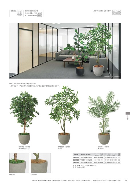 設置方法樹木の固定についてP.16の商品→P.77P.17の商品→P.77GR92GR93スタンド規格サイズのみとなりますオーダー規格受注生産品サイズが大きく印象の強い演出ができます。ヘキサゴンテーブルの真ん中に置くなど、人が集まる広い空間におすすめです。GR5099P.18、GR5093人工樹木GR5092H2100フィカスベンジャミンGR5093H2100パキラGR5094H2050アレカヤシ注文品番本体価格(税込価格)GR5092GR5093GR5094¥166,000(¥182,600)¥172,000(¥189,200)¥115,000(¥126,500)プランター外寸法w×h×d(mm)外寸法(グリーン含む)W×H×D(mm)重量(kg)450×380×450約1200×2100×120012.1450×380×450約1500×2100×120012.2450×380×450約1200×2050×12009.4本体:樹脂プランター(227)詳細→P.79装飾:造花・人工樹木GR5092GR5093※樹や枝、葉の内容が掲載写真と多少異なる場合がございます。※外寸法はグリーンを含んだ総外寸法です。樹や枝の広げ方によってサイズが多少変わります。17