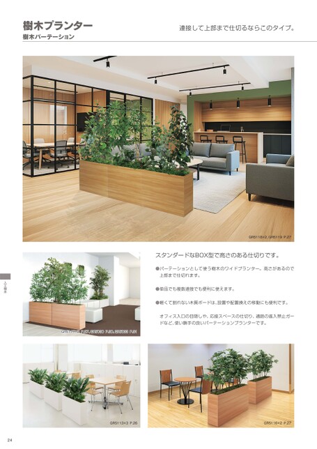 樹木プランター樹木パーテーション連接して上部まで仕切るならこのタイプ。GR5118×2、GR5119P.27スタンダードなBOX型で高さのある仕切りです。●パーテーションとして使う樹木のワイドプランター。高さがあるので上部まで仕切れます。●単品でも複数連接でも便利に使えます。●軽くて割れない木質ボードは、設置や配置換えの移動にも便利です。オフィス入口の目隠しや、応接スペースの仕切り、通路の進入禁止ガードなど、使い勝手の良いパーテーションプランターです。GR5117×2P.27、GR5030P.30、GR5033P.31GR5113×3P.26GR5116×2P.27人工樹木24