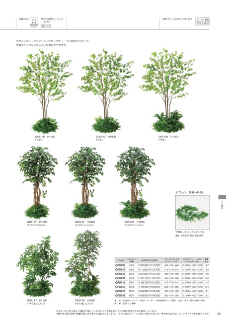 設置方法樹木の固定について→P.77GR137スタンド大サイズやミックスアレンジで仕上げたテーブル樹木の円タイプ。空間のシンボルになるような演出ができます。規格サイズのみとなりますオーダー規格受注生産品人工樹木オプション詳細→P.89下草ピース(ガーランド)1.7m価格¥3,200税込¥3,520)GR5137H1800フィカスベンジャミンGR5141H1800フィカスベンジャミンGR5145H1800フィカスベンジャミン注文品番GR5138GR5142GR5146GR5137GR5141GR5145GR5147GR5148土台パネル明細45Ф53Ф60Ф45Ф53Ф60Ф60Ф60Ф本体価格(税込価格)¥103,000(¥113,300)¥113,000(¥124,300)¥121,000(¥133,100)¥82,100(¥90,310)¥92,700(¥101,970)¥99,900(¥109,890)¥144,000(¥158,400)¥168,000(¥184,800)土台パネル外寸法w×h×d(mm)外寸法(グリーン含む)W×H×D(mm)重量(kg)440×78×440約1200×1900×12008.2515×78×515約1200×1900×12008.9585×78×585約1200×1900×12009.8440×78×440約1000×1800×100010.8515×78×515約1000×1800×100011.5585×78×585約1000×1800×100012.4585×78×585約1200×1500×12009.1585×78×585約800×1600×8009.1GR5147H1500パキラ&シェフレラGR5148H1600トネリコ&シェフレラ本体:5.5mmベニヤシート貼り・ハッポー・12mmMDFシート貼り土台パネル(231)詳細→P.80装飾:造花・人工樹木※土台パネル外寸法は、付属の下草ピースを外した八角形土台パネルの最大対角外寸法を表記しています。※樹や枝、葉の内容が掲載写真と多少異なる場合がございます。※外寸法はグリーンを含んだ総外寸法です。樹や枝の広げ方によってサイズが多少変わります。39GR5138H1900ドウダンGR5142H1900ドウダンGR5146H1900ドウダン