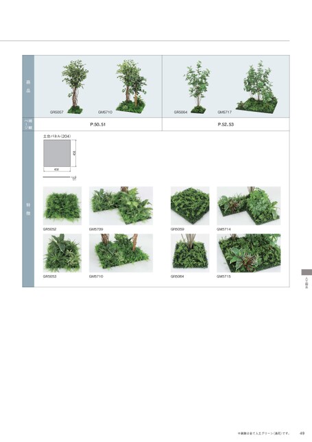 ※装飾は全て人工グリーン(造花)です。49人工樹木GR5053GM5710GR5064GM5715GR5052GM5709GR5059GM5714土台パネル(204)特徴GR5057GM5710GR5064P.50、51GM5717P.52、53商品掲載ページ