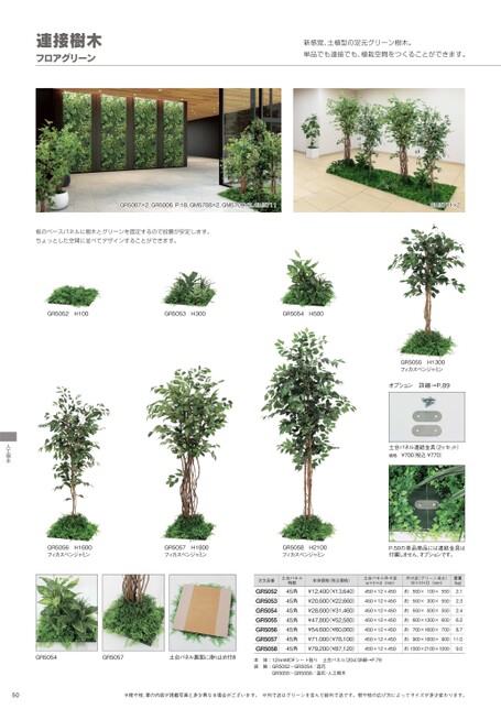 連接樹木フロアグリーン新感覚、土植型の足元グリーン樹木。単品でも連接でも、植栽空間をつくることができます。GR5007×2、GR5006P.18、GM5708×2、GM5709×2、GM5711GM5711×2板のベースパネルに樹木とグリーンを固定するので設置が安定します。ちょっとした空間に並べてデザインすることができます。GR5052H100GR5053H300GR5054H500GR5055H1300フィカスベンジャミンオプション詳細→P.89土台パネル連結金具(2ヶセット)価格¥700税込¥770)人工樹木GR5056H1600フィカスベンジャミンGR5057H1800フィカスベンジャミンGR5058H2100フィカスベンジャミンP.50の単品商品には連結金具は付属しません、オプションです。GR5054GR5057土台パネル裏面に滑り止め付き注文品番GR5052GR5053GR5054GR5055GR5056GR5057GR5058土台パネル明細45角45角45角45角45角45角45角本体価格(税込価格)¥12,400¥13,640)¥20,600¥22,660)¥28,600¥31,460)¥47,800¥52,580)¥54,600¥60,060)¥71,000¥78,100)¥79,200¥87,120)土台パネル外寸法w×h×d(mm)外寸法(グリーン含む)W×H×D(mm)重量(kg)450×12×450約550×100×5502.1450×12×450約550×300×5502.3450×12×450約550×500×5502.4450×12×450約600×1300×6006.2450×12×450約700×1600×7008.7450×12×450約900×1800×90011.0450×12×450約1000×2100×10009.0本体:12mmMDFシート貼り土台パネル(204)詳細→P.79装飾:GR5052-GR5054/造花GR5055-GR5058/造花・人工樹木50※樹や枝、葉の内容が掲載写真と多少異なる場合がございます。※外寸法はグリーンを含んだ総外寸法です。樹や枝の広げ方によってサイズが多少変わります。