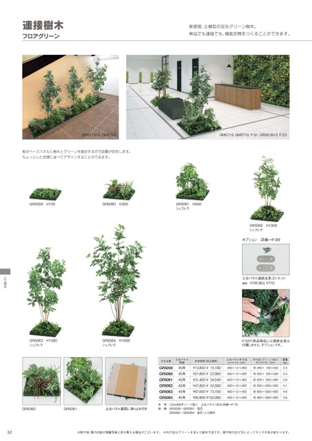 連接樹木フロアグリーン新感覚、土植型の足元グリーン樹木。単品でも連接でも、植栽空間をつくることができます。GM5713×2、GM5714GM5715、GM5710P.51、GR5018×3P.23板のベースパネルに樹木とグリーンを固定するので設置が安定します。ちょっとした空間に並べてデザインすることができます。GR5059H100GR5060H300GR5061H550シェフレラGR5062H1000シェフレラオプション詳細→P.89土台パネル連結金具(2ヶセット)価格¥700税込¥770)人工樹木GR5063H1500シェフレラGR5064H1800シェフレラP.52の単品商品には連結金具は付属しません、オプションです。GR5060GR5061土台パネル裏面に滑り止め付き注文品番GR5059GR5060GR5061GR5062GR5063GR5064土台パネル明細45角45角45角45角45角45角本体価格(税込価格)¥13,800(¥15,180)¥21,800(¥23,980)¥31,400(¥34,540)¥47,800(¥52,580)¥67,000(¥73,700)¥92,800(¥102,080)土台パネル外寸法w×h×d(mm)外寸法(グリーン含む)W×H×D(mm)重量(kg)450×12×450約450×100×450450×12×450約550×300×550450×12×450約500×550×500450×12×450約500×1000×500450×12×450約600×1500×600450×12×450約900×1800×9002.32.42.64.14.65.8本体:12mmMDFシート貼り土台パネル(204)詳細→P.79装飾:GR5059-GR5061/造花GR5062-GR5064/造花・人工樹木52※樹や枝、葉の内容が掲載写真と多少異なる場合がございます。※外寸法はグリーンを含んだ総外寸法です。樹や枝の広げ方によってサイズが多少変わります。