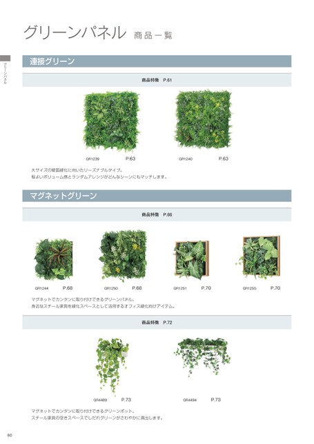 GR1239P.63GR1240P.63大サイズの壁面緑化に向いたリーズナブルタイプ。程よいボリューム感とランダムアレンジがどんなシーンにもマッチします。マグネットグリーン商品特徴P.66GR1244P.68GR1250P.68GR1251P.70GR1255P.70マグネットでカンタンに取り付けできるグリーンパネル。身近なスチール家具を緑化スペースとして活用するオフィス緑化向けアイテム。商品特徴P.72GR4489P.73GR4494P.73マグネットでカンタンに取り付けできるグリーンポット。スチール家具の空きスペースでしだれグリーンがさわやかに演出します。60グリーンパネル商品一覧商品特徴P.61連接グリーングリーンパネル