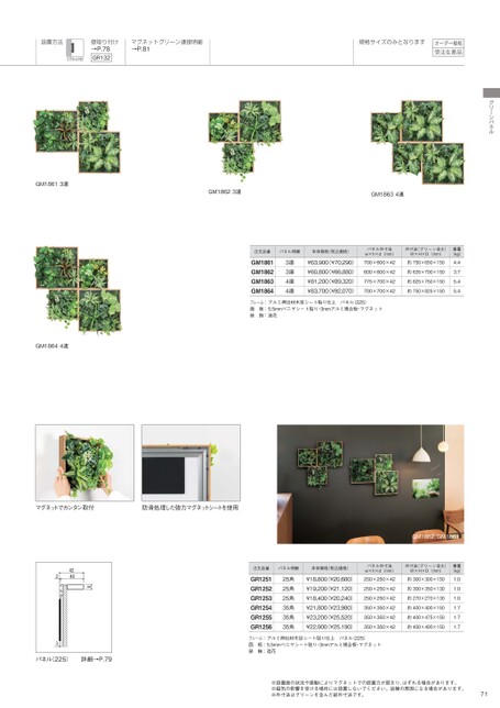 グリーンパネル設置方法壁取り付け→P.78GR132マグネット付けマグネットグリーン連接明細→P.81規格サイズのみとなりますオーダー規格受注生産品GM18613連GM18623連GM18634連注文品番パネル明細本体価格(税込価格)パネル外寸法w×h×d(mm)外寸法(グリーン含む)W×H×D(mm)重量(kg)GM1861GM1862GM1863GM18643連3連4連4連¥63,900¥70,290)¥60,800¥66,880)¥81,200¥89,320)¥83,700¥92,070)700×600×42約750×650×150600×600×42約635×700×150775×700×42約825×750×150700×700×42約750×825×1504.43.75.45.4フレーム:アルミ押出材木目シート貼り仕上パネル(225)面板:5.5mmベニヤシート貼り・3mmアルミ複合板・マグネット装飾:造花GM18644連マグネットでカンタン取付防滑処理した強力マグネットシートを使用パネル(225)詳細→P.79GM1862、GM1861注文品番パネル明細本体価格(税込価格)GR1251GR1252GR1253GR1254GR1255GR125625角25角25角35角35角35角¥18,800(¥20,680)¥19,200(¥21,120)¥18,400(¥20,240)¥21,800(¥23,980)¥23,200(¥25,520)¥22,900(¥25,190)パネル外寸法w×h×d(mm)外寸法(グリーン含む)W×H×D(mm)重量(kg)250×250×42約300×300×150250×250×42約300×350×130250×250×42約270×270×130350×350×42約400×400×150350×350×42約400×475×150350×350×42約400×400×1501.01.01.01.71.71.7フレーム:アルミ押出材木目シート貼り仕上パネル(225)面板:5.5mmベニヤシート貼り・3mmアルミ複合板・マグネット装飾:造花※設置面の状況や振動によりマグネットでの設置力が弱まり、はずれる場合があります。※磁気の影響を受ける場所には設置しないでください。故障の原因になる場合があります。※外寸法はグリーンを含んだ総外寸法です。71