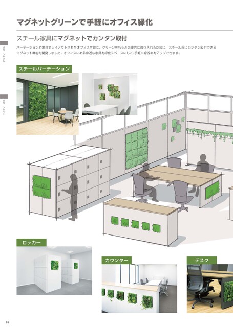 マグネットグリーンで手軽にオフィス緑化スチール家具にマグネットでカンタン取付パーテーションや家具でレイアウトされたオフィス空間に、グリーンをもっと効果的に取り入れるために、スチール面にカンタン取付できるマグネット機能を開発しました。オフィスにある身近な家具を緑化スペースにして、手軽に緑視率をアップできます。スチールパーテーションロッカーカウンターデスクグリーンパネルグリーンポット74