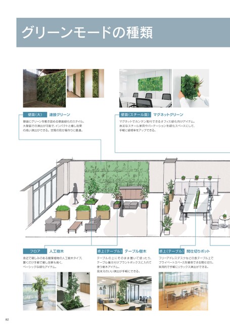 グリーンモードの種類壁面(大)連接グリーン壁面(スチール面)マグネットグリーン壁面にグリーンを敷き詰める壁面緑化のスタイル。大壁面での演出が可能で、インパクトと癒し効果の高い演出ができる。空間の見せ場作りに最適。マグネットでカンタン取付できるオフィス緑化向けアイテム。身近なスチール家具やパーテーションを緑化スペースにして、手軽に緑視率をアップできる。フロア人工樹木卓上(テーブル)テーブル樹木卓上(テーブル)間仕切りポット身近で親しみのある観葉植物の人工樹木タイプ。置くだけ手軽で癒し効果も高く、ベーシックな緑化アイテム。テーブルの上にそのまま置いて使ったり、テーブル備え付けプラントボックスに入れて使う樹木アイテム。見栄えのいい演出が手軽にできる。フリーアドレスデスクなどの長テーブル上でプライベートスペースを確保できる間仕切り。実用的で手軽にリラックス演出ができる。82