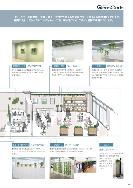 グリーンモードは壁面・天井・卓上・フロアで使える多彩なグリーンスタイルを取り揃えています。空間に合わせてトータルコーディネートでき、居心地のいいグリーン空間が手軽に作れます。壁面(中〜小)インテリアデコ壁面(上部)ウォールポット天井ハンギングポットアートを飾るように壁面演出するスタイル。空間の魅力を上げて整えるアクセサリーとして重宝する。壁面に取り付けできる自然スタイルのグリーンポット。壁面上部の空きスペースを有効利用したしだれラインの演出がおすすめ。天井のダクトレールや、やぐらブース、既存パーテーションに引掛けて設置するグリーンポット。目線の高さでグリーンを楽しめ、立体感ある演出ができる。卓上(キャビネット)インテリアポットフロアパーテーション置くだけで手軽に使えるミニタイプのポット。インテリアに合わせやすいデザインがいろいろある。動線や区画作りに使えるフロア仕切り。バリエーションが豊富で、用途や家具テイストに合わせて選べる。フロア装飾プランターデザインにこだわった新感覚の装飾スタンド。家具周りやコーナーなど、ちょっとした空きスペースに置くと空間を手軽にセンスアップできる。83