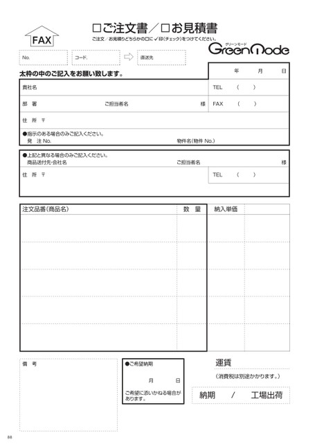 FAXご注文書/お見積書ご注文/お見積りどちらかのに印(チェック)をつけてください。No.コード.直送先太枠の中のご記入をお願い致します。貴社名部署住所〒年月日TEL()ご担当者名様FAX()●指示のある場合のみご記入ください。発注No.●上記と異なる場合のみご記入ください。商品送付先・会社名住所〒物件名(物件No.)ご担当者名様TEL()注文品番(商品名)数量納入単価備考●ご希望納期運賃月日(消費税は別途かかります。)ご希望に添いかねる場合があります。納期/工場出荷88
