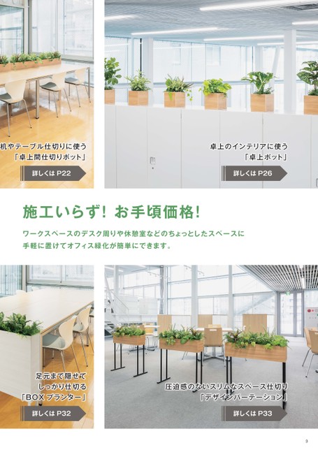 机やテーブル仕切りに使う「卓上間仕切りポット」詳しくはP22卓上のインテリアに使う「卓上ポット」詳しくはP26施工いらず!お手頃価格!ワークスペースのデスク周りや休憩室などのちょっとしたスペースに手軽に置けてオフィス緑化が簡単にできます。足元まで隠せてしっかり仕切る「BOXプランター」詳しくはP32圧迫感のないスリムなスペース仕切り「デザインパーテーション」詳しくはP333